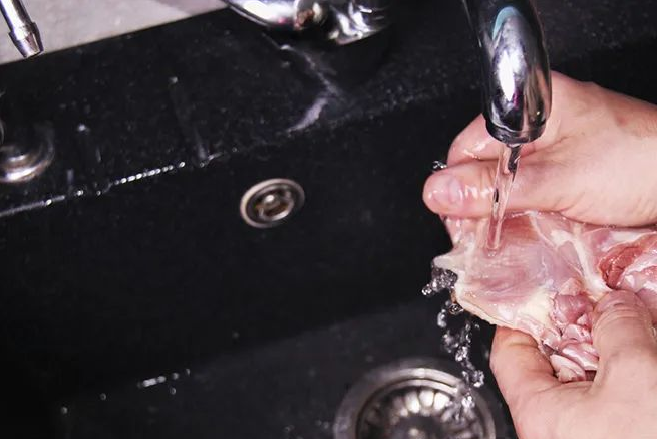 生肉在运输、存储过程中,表面可能沾染存留一些细菌、病毒等,如果直接用水龙头冲洗生肉,不但不能杀死上面的微生物,四处飞溅的水花还会让它们污染厨房水槽、案板、餐具!