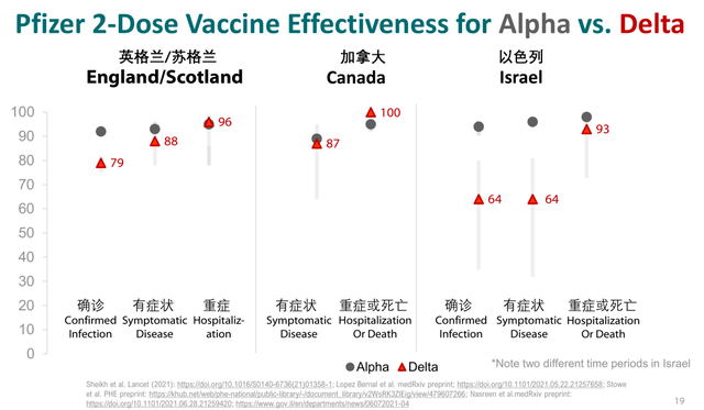 8. 来自英国、加拿大、以色列的数据显示,辉瑞的两剂mRNA疫苗针对Delta变异株有保护作用;但是,与最初流行的Alpha毒株相比,疫苗针对Delta毒株的保护力要弱一些(图2);