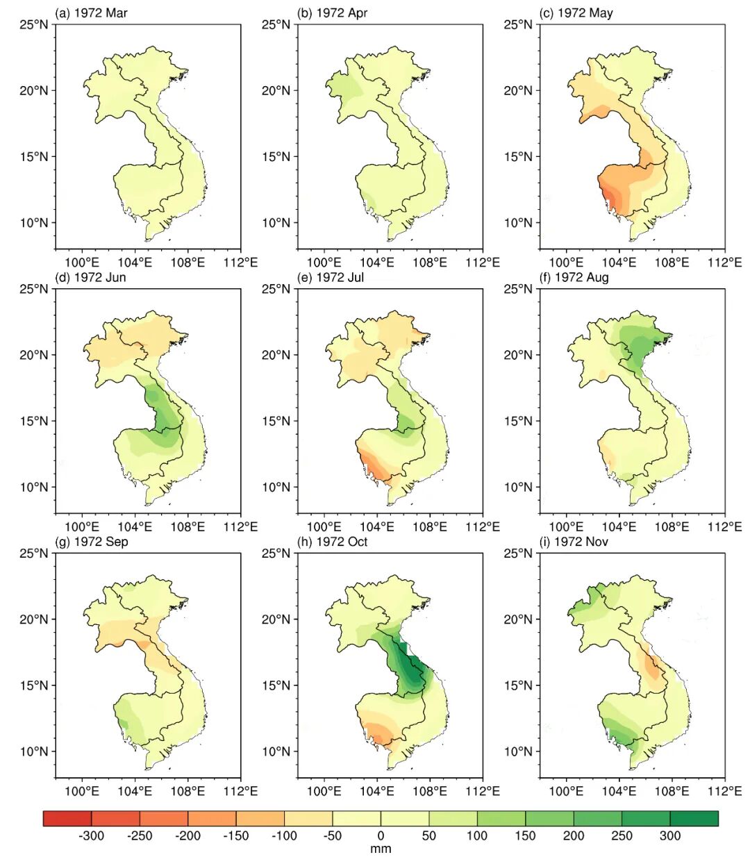 图8 1967-1972年的雨季降水异常图(黑框内表示胡志明区域),这里颜色越红,表明降雨较往常偏少,偏干旱;颜色越绿, 表明降雨较往常偏多,偏洪涝