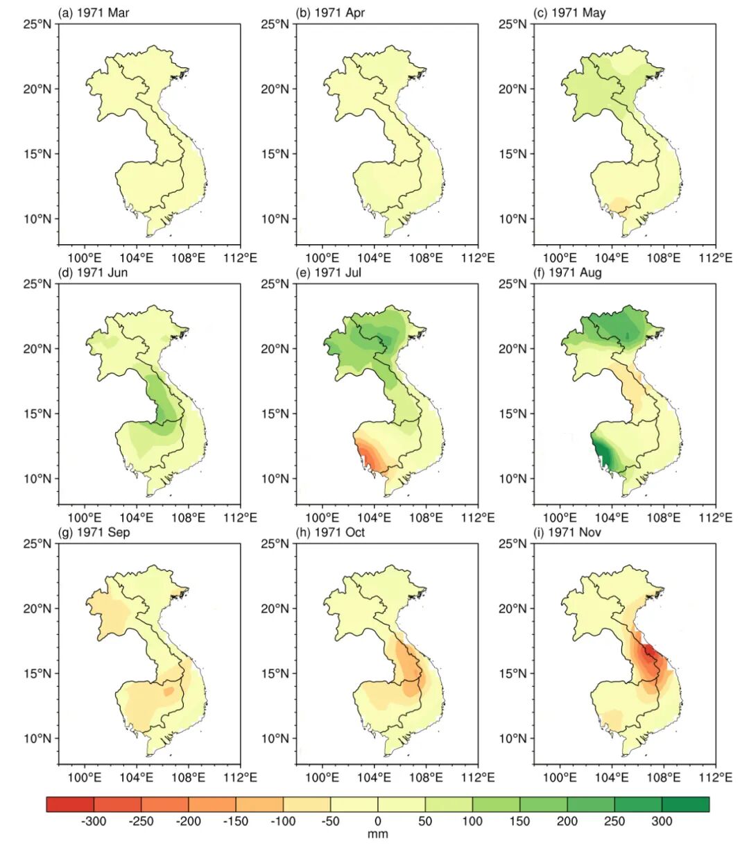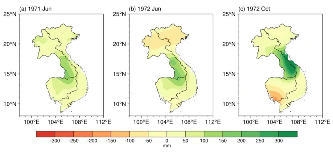 再来看看解密材料中军方提到1971年6月的例子。从1971-1972年期间雨季的逐月降水异常(图10d,11d,12a-b)可以看到该月的确降水偏多,但强度并不突出。且6月2-9日还有台风活动,很难说这一降水异常是由人工降雨还是自然变化导致的。而纵观1971-1972年的降水变化,事实上异常最强的月份是1972年10月,较历史同期偏多达300毫米,但美军的“大力水手”早已于同年7月悄然结束。