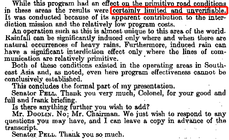 花了这么多钱,效果如何呢?与如今互联网盛传的“造成大洪水、影响降水持续6个月、造成的损失甚至比整个越战时期飞机轰炸还要大”等不同,会议最后认为这个项目的效果是有限、且无法证实的(“certainly limited”and “unverifiable”)(图4)。
