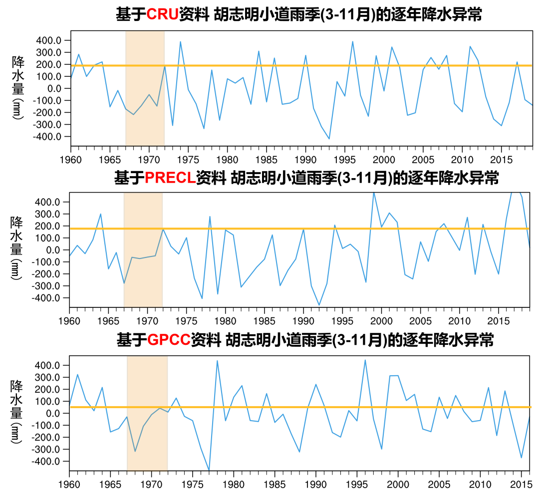 通过计算黑框区域的平均降水异常时间序列(图9),还会发现这6年中有5年的时间(1967-1971年)该地区的降水均偏少,其中1968-1969年降水相比均值更是偏少了150mm以上。而1972年尽管降水偏多,但将其放到整个历史时期来看,降水强度也无法排进前10。为确保结果可靠,我们还使用了另两套降水资料进行分析(图9)(编者注:GPCC来自于美国全球降水气候中心,PRECL来自于美国国家海洋和大气管理局,也是当前应用最广泛的全球格点化的陆面降水资料之一)结果与CRU资料十分吻合。