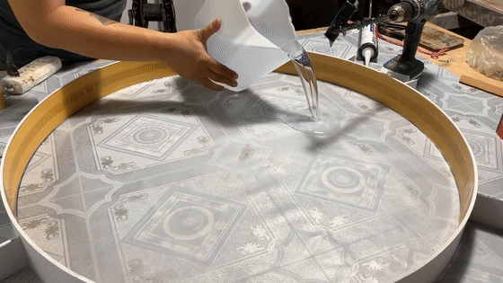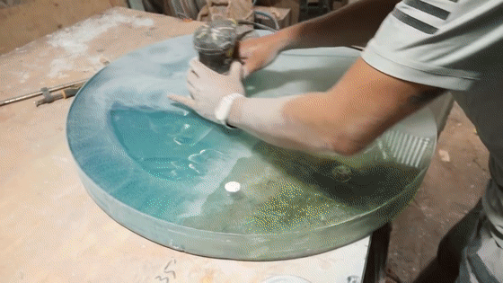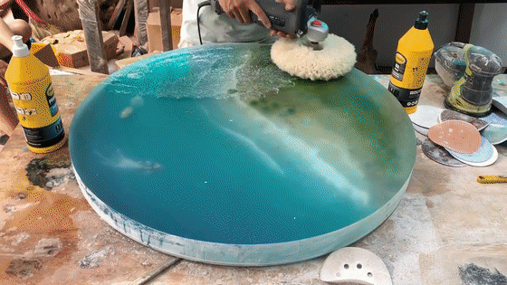 创作阶段结束之后,到了一个磨人的阶段——消除气泡。树脂桌子想要平滑如镜面一般,一定不能有气泡,就像贴手机膜一样。