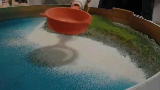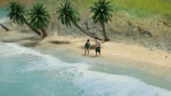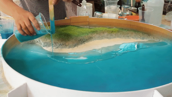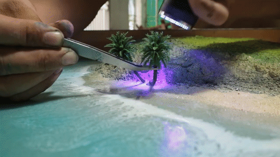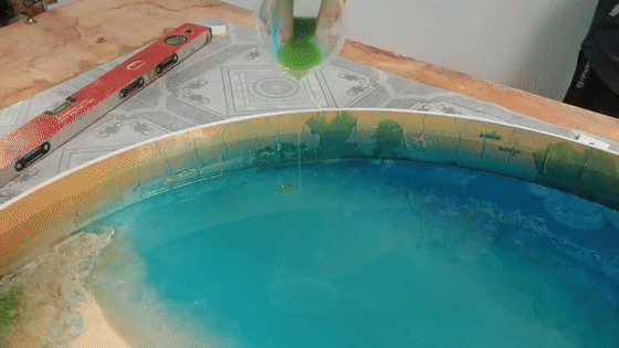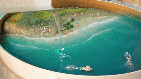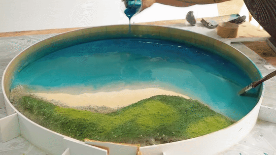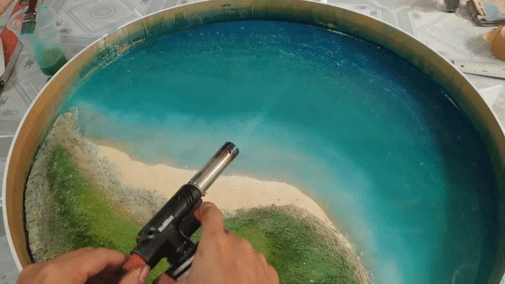 小哥用三种不同颜色的树脂倒在了海面不同的区域,靠近沙滩的部分蓝色最浅: