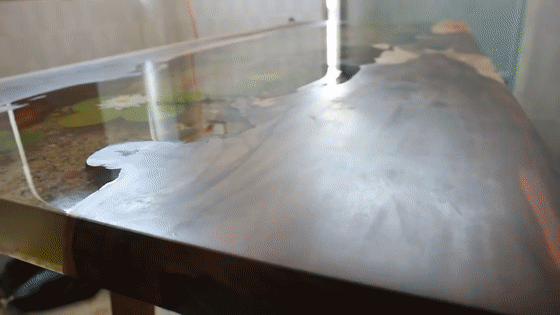 全部完成之后,平整透明的桌面像镜子一样,都能显现出天花板的景象。再看桌面中,几条锦鲤像是琥珀中被永久定格的小生命一样。