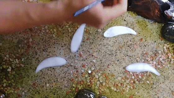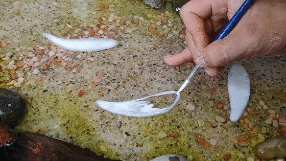 他详细展示了这些鱼怎么在桌内从无到有,最后变成裸眼3D。他在做好河床搭建之后,浇灌了薄薄一层树脂当作画板。待风干后,越南小哥蘸取白色丙烯酸颜料开始描绘鱼身: