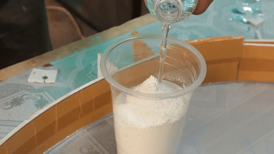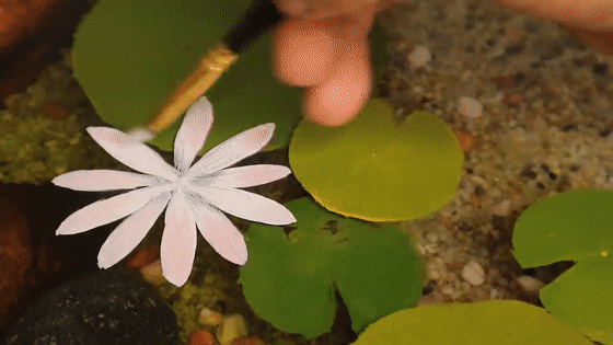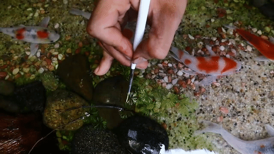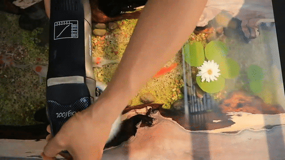小哥表示无须担心,给鱼做好最后的收尾工作后,便补充水草、荷叶、荷花等水底植物,然后注满树脂,等待晾干: