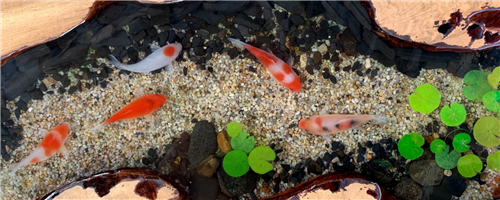 正是因为喜爱,所以他一直在探索环氧树脂桌的更多艺术可能性。于是,有了这张差点引发网友援救锦鲤的桌子。