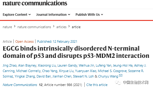 王春雨说:“EGCG和MDM2都结合在p53的N末端结构域的同一位置,因此EGCG与MDM2互为竞争关系。当EGCG与p53结合时,该蛋白质不会通过MDM2降解,因此p53的水平会随着与EGCG的直接相互作用而增加,这意味着更多的p53具有抗癌功能。这是非常重要的相互作用。 ”论文链接: