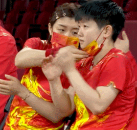 乒乓女子团体赛上,孙颖莎正在对陈梦咬耳朵说悄悄话。陈梦转头瞅见她没好好戴口罩,手也不拍了,赶紧把孙颖莎的口罩往上拉,“你可别叭叭了,先把口罩戴戴好。”