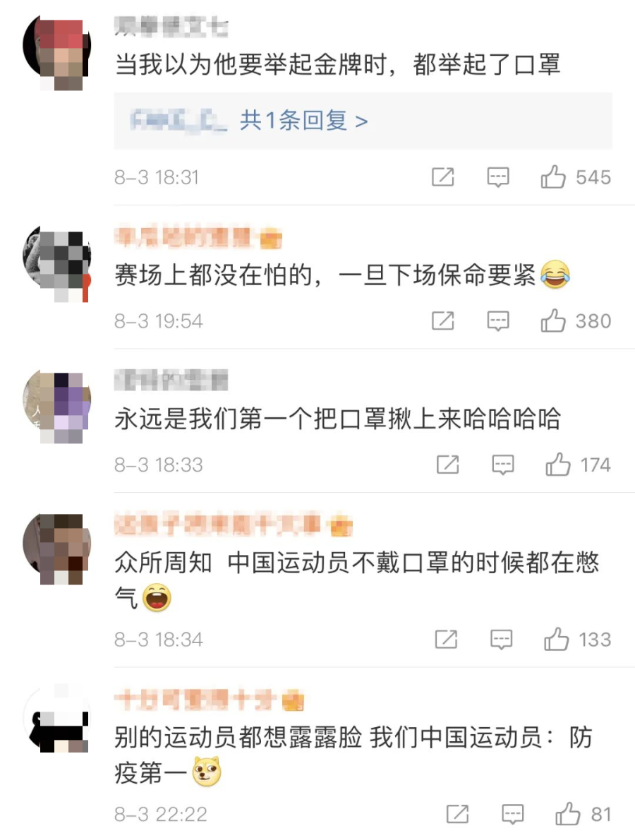 网友说:中国运动员不是戴着口罩,就在戴上口罩的路上,“戴口罩是刻在中国人的DNA里了吧!”