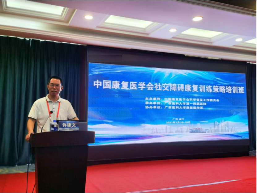 7月16~18日,由中国康复医学会科学普及工作委员会主办、广西医科大学第一附属医院承办、广西医科大学康复医学系协办的《社交障碍康复训练策略培训班》在广西南宁顺利举办,这是国内首次针对儿童社交障碍系统开设的康复训练策略培训班。中国康复医学会科学普及工作委员会副主任委员、广西医科大学第一附属医院康复医学科主任许建文教授,深圳大学第一附属医院、深圳市第二人民医院口腔科语言障碍专科杨峰博士和王琳言语治疗师出席开班仪式;因工作时间冲突不能来到现场的中国康复医学会科学普及工作委员会主任委员、上海交通大学附属新华医院康复医学科主任杜青教授发来贺信,广西医科大学第一附属医院康复医学科儿童康复专科副主任韦爱玲博士主持开班仪式。 本次培训班主要由深圳大学第一附属医院口腔科语言障碍专科杨峰博士团队授课。此外,广西医科大学第一附属医院康复医学科许建文教授、张莉博士、韦爱玲博士、贺佳果言语治疗师等也就社交障碍相关领域先后授课,内容涵盖高功能自闭症儿童的特征、社交沟通的理论架构、社交沟通训练的主要内容、活动体验以及自闭症病因学进展、骨质疏松性椎体骨折患者社交障碍康复等内容。既有理论授课又有实训操作工作坊,提升了学员关于社交障碍康复训练的专业知识及实践能力。来自区内外医疗单位、康复研究及训练机构、幼儿园、特殊教育学校等近50名学员在学习过程中互动频繁,表现出了极高的学习热情,收益颇丰,学员们明显表现出把所学所思与各自岗位紧密结合的愿望,大家希望日后继续共同推动社交障碍康复相关技术及技能的培训及推广工作,为广西乃至中国康复事业发展做出应有的贡献。