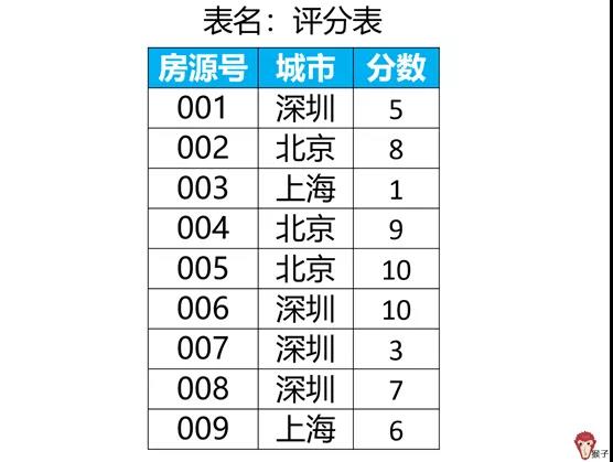 评分表里记录了各个城市房源的评分,包括房源号、城市、分数。