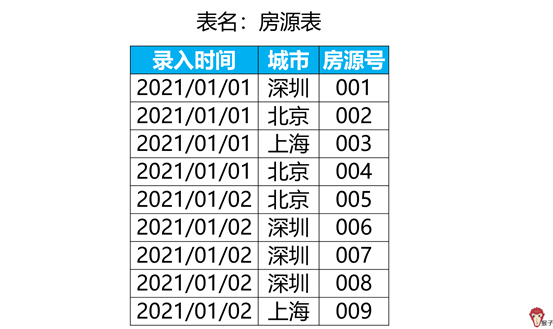 “房源表”是各个城市每天新增房源的名单,包括房源号、城市、录入时间。现在需要分析出每天每个城市有多少新增房源?