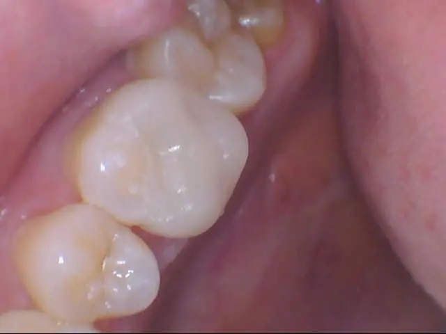从图中可以看出嵌体远中边缘没有悬突,与牙体边缘密合相接。嵌体在最终戴入患者口内的时候,堪称完美。在使用上没有任何的影响和不适,而且坚固耐用。