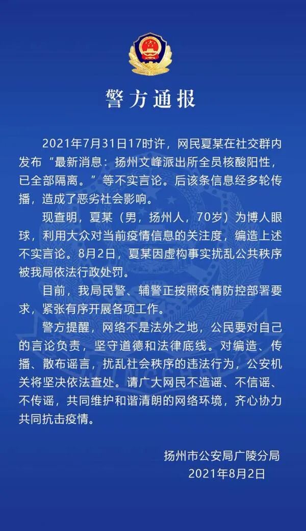2021年8月2日,扬州市公安局广陵分局发布通报,2021年7月31日17时许,网民夏某在社交群内发布“最新消息:扬州文峰派出所全员核酸阳性,已全部隔离。”等不实言论。后该条信息经多轮传播,造成了恶劣社会影响。现查明,夏某(男,扬州人,70岁)为博人眼球,利用大众对当前疫情信息的关注度,编造上述不实言论。8月2日,夏某因虚构事实扰乱公共秩序被广陵分局依法行政处罚。