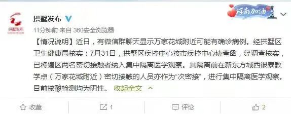 近日,有微信群聊天显示杭州万家花城附近可能有确诊病例。经杭州拱墅区卫生健康局核实:7月31日,拱墅区疾控中心接市疾控中心协查函,经调查核实,已将辖区两名密切接触者纳入集中隔离医学观察。其隔离前在新东方城西银泰教学点(万家花城附近)密切接触的人员亦作为“次密接”,进行集中隔离医学观察。目前核酸检测均为阴性。