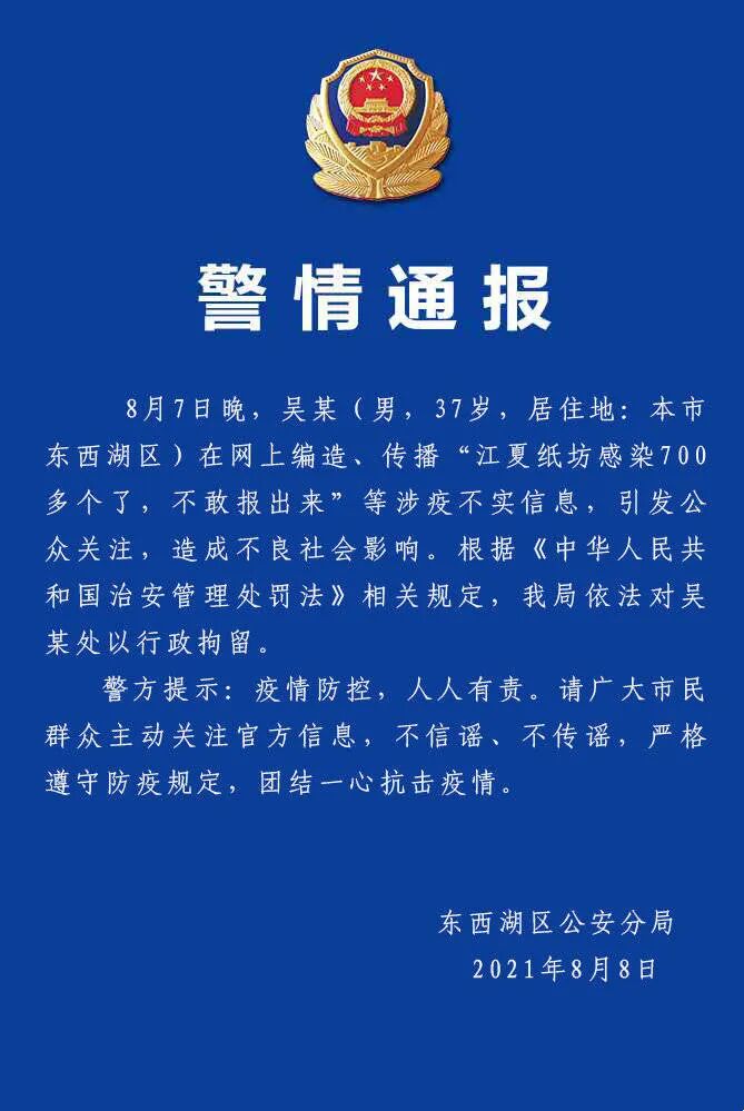 通报称,8月7日晚,吴某(男,37岁,居住地:本市东西湖区)在网上编造、传播“江夏纸坊感染700多个了,不敢报出来”等涉疫不实信息,引发公众关注,造成不良社会影响。根据《中华人民共和国治安管理处罚法》相关规定,我局依法对吴某处以行政拘留。