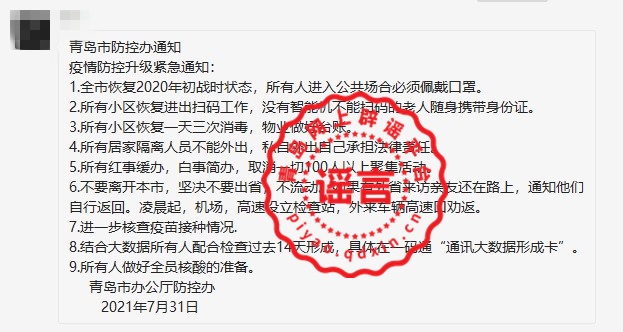 近日,部分青岛市民的微信群及社交平台流传一则《疫情防控升级紧急通知》,列举了包括“全市恢复2020年初战时状态”等9条疫情防控举措,落款为“青岛市办公厅防控办”。经核实,此为谣言。