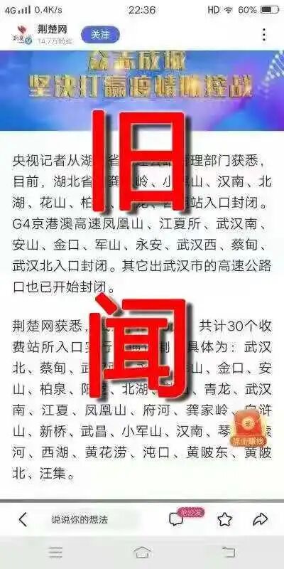 8月2日,网上流传图片信息称,武汉各高速公路入口已开始封闭。经查,该信息实际为2020年1月23日,武汉封闭进出城通道时的新闻。请大家不信谣、不传谣,以官方公布正式信息为准。