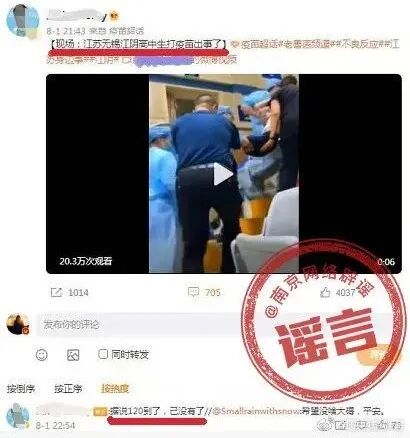 8月2日,江阴发布对此进行辟谣,视频内容的当事人为江阴某中学学生,7月31日下午在接种疫苗约5分钟后出现了头晕、出冷汗、视物模糊的情况,值守医务人员立即将该学生转入应急处置室,考虑因紧张引起的晕针反应,让其卧床休息、吸氧,约10分钟后不适情况完全缓解。留观满30分钟后该名学生由家长陪同离开,未至医院就诊,目前学生身体无异常。