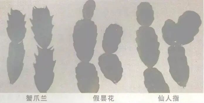 仙人掌科假昙花属植物。植株呈悬垂状,呈浅灰绿色,易木质化;分枝节状。叶片扁平,长圆形,通常为绿色,边缘深红色。 还在傻傻分不清楚,看这里: 一、花期不同 蟹爪兰盛花期在12月,仙人指盛花期在1月中旬至2月中旬,假昙花盛花期在4月中旬到5月中旬。 二、花的特征不同 1、蟹爪兰和仙人指的花筒较长,假昙花的花筒较短; 2、蟹爪兰叠层花瓣,仙人指有两层花瓣,假昙花为单层花瓣; 3、蟹爪兰花瓣两侧对称排列,仙人指和假昙花的花瓣呈辐射状对称排列; 4、蟹爪兰的花托光滑无棱或少有钝棱,仙人指的花托棱柱明显,假昙花花托为五棱型。 三、变态茎不同 蟹爪兰的变态茎上有明显的尖刺,像蟹爪,仙人指和假昙花的变态茎较圆滑; 假昙花的变态茎边缘为红紫色,蟹爪兰和仙人指二者没有(见下图)。 蟹爪兰、假昙花和仙人指的变态茎(赵广文/摄) 今天的介绍就到这里了,过圣诞节除了布置圣诞树,小伙伴们也可以摆上几盆热情的圣诞仙人掌咯! 参考文献: 敖永长. 详说蟹爪兰与仙人指的区别[J]. 中国花卉盆景, 2013(7):35-35. 李小峰, 齐欣, 高彦辉, 等. 蟹爪兰的生物学特性及栽培技术[J]. 甘肃农业科技, 2012(7):59-61. 赵广文. 蟹爪兰、仙人指、假昙花的区别[J]. 中国花卉盆景, 2005(6):35-35. 中国科学院华南植物研究所.广东植物志(第四卷).广东省:广东科技出版社,2000年12月:139-140