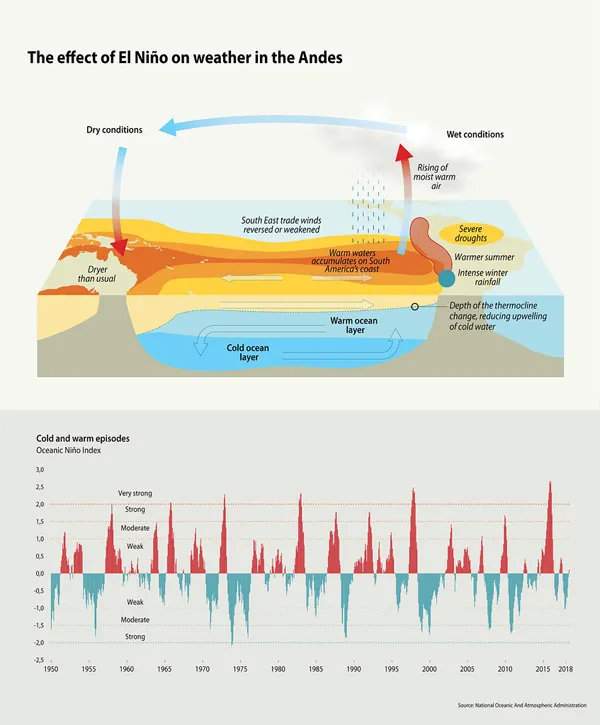 另一个例子是关于厄尔尼诺-南方涛动(ENSO):厄尔尼诺现象是热带太平洋地区温度的一种不规则变化,洋流和大气之间相互作用引起海洋温度升高,每次升温事件之间大约间隔4年。这一现象对太平洋地区,乃至是全世界的经济发展都有重大影响。如果我们可以更好地预测它,那么这将有助于太平洋地区的人们做好准备。