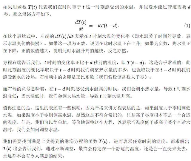 你一定经历过洗澡时水温过热或过冷时的情况,结果调节过量又导致水太烫或太凉了。其实有一个数学方程可以描述这种现象,我们也可以形象地称它为“淋浴方程”,而其中的关键就是延迟——因为水从水管流出需要时间。方程求得的结果是真正能调出最佳温度,还是就只能凑合洗洗?生活中,涉及到延迟的现象太多了,那么淋浴方程又能用在何处?