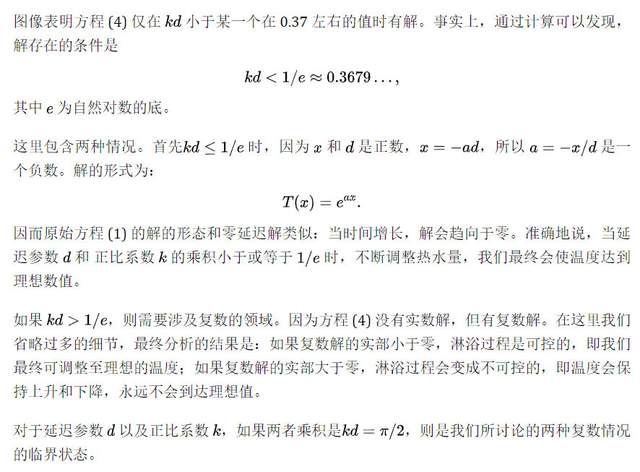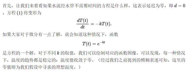 (1)这类方程也被称为微分方程,因为方程里涉及一个变化率的量,即导数。尽管这个方程很不容易求解,但我们至少可以探索解的大致形态——当然,要涉及一点微积分的知识。如果大家觉得有些烧脑,不妨跳至文章最后,可以看看淋浴方程的重要应用。