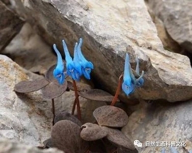 紫堇科紫堇属(Corydalis)植物在香格里拉约有40 多种,生长在高山流石滩中,其根深植于岩石缝中,长长的叶柄弯弯曲曲,很有特色。三叶紫堇(C.hemidicentra),花蓝灰色,生在长叶柄的顶部,花瓣中有距,其叶片的颜色与周围碎石非常相似,形成“拟态”。其藏药名叫“俄瓦德”,可治流感发烧。