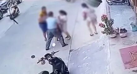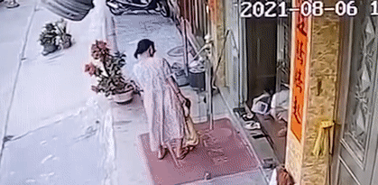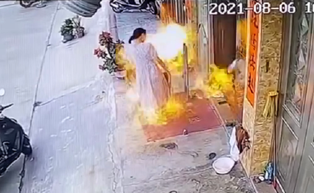 广东揭阳一女子蹲在店铺门口用酒精灯烤鱿鱼,