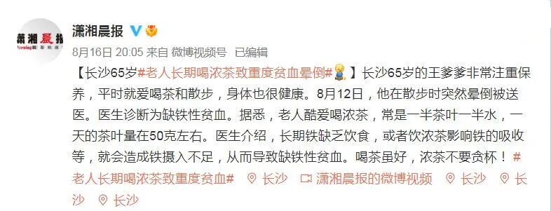 近日一则新闻引起关注:长沙一位65岁老人因长期喝浓茶致重度贫血,他在散步时突然晕倒被送医。据悉,老人酷爱喝浓茶。