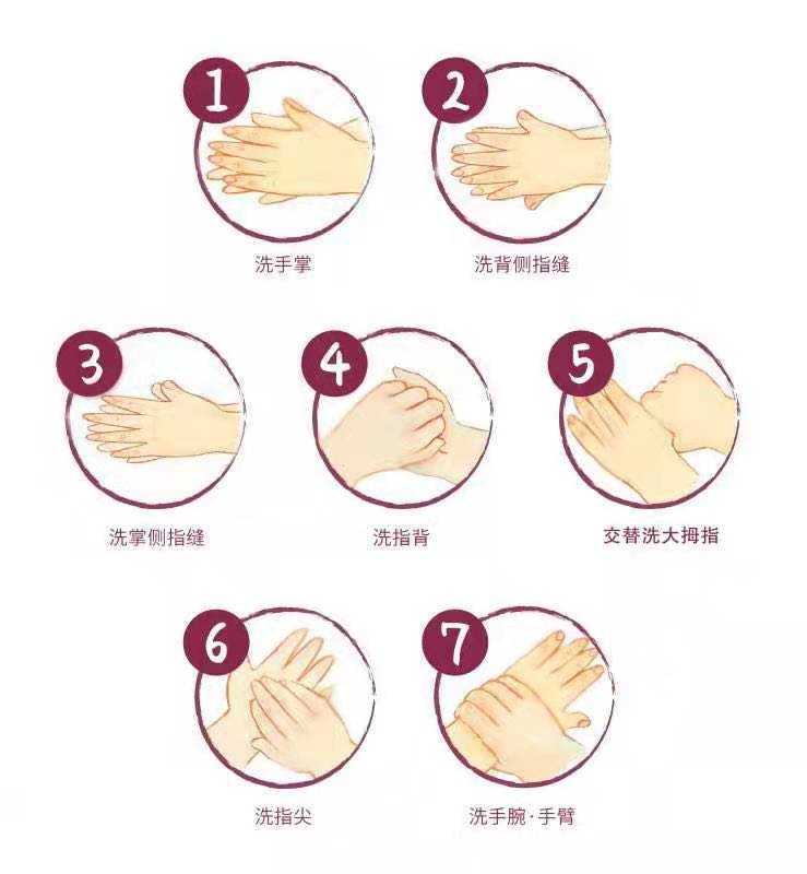 1. 手部有明显污染物时; 2. 清洁操作前,如护理老人,饮食,触摸口鼻前; 3. 污染操作后,如接触垃圾,上厕所后和咳嗽,打喷嚏用手捂后。 三、标准的洗手方式 七步洗手法(内外夹弓大立腕) 1. 掌心相对,手指合拢,相互揉搓洗净手掌; 2. 手心对手背,手指交叉,沿指缝相互揉搓洗净手背; 3. 掌心相对,双手交叉,相互揉搓洗净指缝; 4. 双手轻合成空拳,相互揉搓洗净指背; 5. 一手握住另一手的大拇指旋转搓揉,洗净大拇指; 6. 将一手五指指尖并拢在另一手的掌心处揉搓,洗净指尖; 7. 螺旋式擦洗手腕,交替进行。 四、用什么洗手 洗手液、肥皂、香皂是常用的洗手用品,建议首选洗手液,因为洗手液中添加杀菌成分,能有效抑制或杀灭手上沾染的各种细菌,还含有护理成分,包括润肤剂,能够减少刺激,滋润皮肤。肥皂和香皂的主要作用是洗涤,并不能完全杀死细菌,且若是肥皂和香皂共同使用,还可能造成交叉感染,肥皂、香皂和皂盒本身也容易滋生细菌。洗手液瓶身完全封闭,使用时能够避免手接触液体本身,从而能够有效避免上述问题。 五、无法洗手时怎么办? 无法洗手时首选含醇类的速干手消毒剂,醇类过敏者可选用季铵盐类等非醇类手消毒剂,取1-2ml消毒剂于掌心,参照标准洗手方法揉搓至干燥。 六、洗手后,不做甩手掌柜 洗手后要及时把手擦干,这是因为下落的水滴可以把细菌病毒带到其他地方,加快细菌繁殖,所以,手擦干不仅仅擦掉了水,一些“漏网”的细菌病毒也能从手上脱离。也正是这个原因,擦手时不推荐用毛巾,更不要用湿毛巾,因为一旦反复用就不干净了,推荐使用一次性纸巾轻轻地将手擦干。 关注自身健康, 筑牢防疫屏障, 力争8月底控制住疫情!