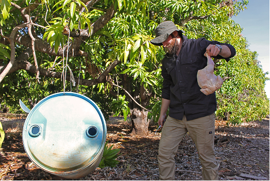 一些澳大利亚芒果种植者认为,引诱苍蝇到他们的果树上可以改善授粉和增加产量。作为测试该计划的第一步,昆虫学家Jonathan Finch在酒桶里装满了鸡和鱼的混合物,产生让苍蝇难以抗拒的气味。图源:AMY-MARIE GILPIN