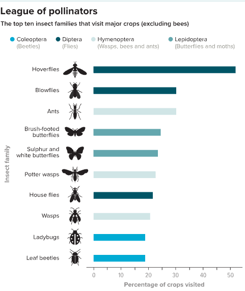 蜂类,尤其是蜜蜂,获得了大部分的赞誉,但甲虫、蝴蝶、飞蛾、蚂蚁、苍蝇等却被忽视和低估了。在Rader的分析中,只有少数作物只通过蜜蜂传粉,大多数作物既会被蜜蜂传粉,也会被其他昆虫传粉。除此之外,Radar和他的同事评估了每种昆虫的贡献,发现苍蝇是继蜜蜂之后最重要的传粉媒介,传粉对象包含了上述105种作物中的72%。