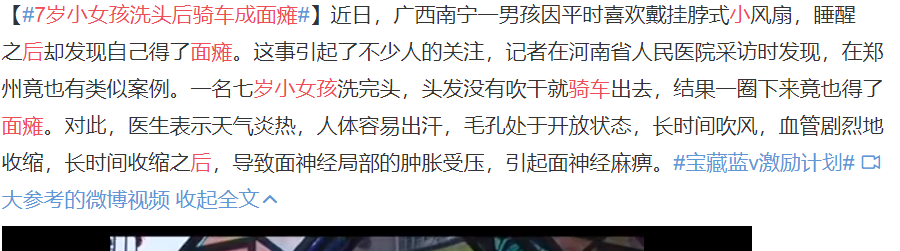 每年一到夏天,各种长时间吹风扇或空调导致面瘫的新闻,就会在各大媒体上出现,吓得许多小伙伴(不包括蝌蚪君)连空调和风扇都不敢开了。 来源新浪微博截图 尽管现在已经立秋,但是高温却并没有离我们远去。俗话说:秋后一伏,热死老牛,在这样的天气里,要人坚持不吹凉风还真是强人所难…… 那么,面瘫究竟是什么?人为什么会出现面瘫?空调和风扇还能想开就开吗? 01 面瘫就是面无表情吗? 近年来,我们经常看到许多演技欠佳的演员(比如那些演高冷霸总的),被网友们评价为“面瘫式”表演,似乎面瘫就是面无表情的另一种叫法。 来源网剧《万万没想到》截图 许多人不知道的是,虽然在日常生活中面无表情的样子常被人们称为“面瘫脸”,但它和真正的面瘫之间,还是有很大区别的。 面神经走形&面瘫患者的典型表现 那么,真正的面瘫究竟有着怎样的表现呢? 要回答这个问题,还要从面瘫的定义说起。 通常所说的面瘫,是指一种名为特发性面神经麻痹的疾病,又称Bell麻痹(Bell palsy),是一种由非特异性面神经炎引起的周围性面神经麻痹。 由大脑发出的面神经,能够支配除上睑提肌和咀嚼肌以外,所有面部肌肉的运动,同时还调控泪腺、舌下腺以及颌下腺的分泌功能,并在味觉以及部分面部感觉的产生过程中发挥了重要作用。 而绝大多数的面神经麻痹只累及一侧面神经,很少会出现双侧发病的情况,因此,面瘫患者一侧的表情肌瘫痪,通常会出现口角歪斜、讲话漏风、流涎等症状,有时还伴有面部、耳后、耳内等部位的疼痛。 所以,面瘫并不是面无表情,恰恰相反,表情过于夸张扭曲才是面瘫最常见的表现。 02 面瘫的锅,该谁来背? 面瘫虽然不会危及生命,但是会严重影响美观,而且由于面部肌肉瘫痪,吃饭说话等日常活动也无法正常进行,对患者的身心健康都是一次沉重的打击。 那么,人好好的为什么会面瘫呢? 到目前为止,医学界尚未查明面瘫的确切病因,许多人都认为此病是由噬神经病毒入侵面神经,导致神经水肿,造成面神经局部受压麻痹引起的,也有人认为,面瘫的发作与患者自身的免疫反应有关。 而对于诸如长时间吹风扇、空调,洗头不吹干,突然受凉等行为会导致面瘫的说法,尽管生活中许多人都对此深信不疑,但是并没有明确的证据表明面瘫与这些因素之间存在直接的相关关系,面瘫的发病也没有明显的季节变化,所以也不存在夏季更容易发生面瘫的结论。 有关热射病的报道,同样是夏季的热门新闻 所以为了“预防”面瘫,顶着高温预警也坚持不开空调是完全没有必要的,不仅不一定能起到预防效果,一旦因为长时间待在高温环境中患上热射病,反而还有可能引发多器官系统功能衰竭,遇到生命危险。 03 面瘫应该如何防治? 人群中面瘫的发病率大约为万分之二,各个年龄段均有分布,其中以20-40岁的男性最为多见。 大多数的面神经麻痹患者,即使不接受任何治疗,也会在起病后的1-2周开始自行恢复,通常只需要数周或数月的时间,就能基本恢复正常。 然而,也有一小部分病人的面瘫症状终身不能完全恢复,还可能留下味觉缺失、阵发性面肌痉挛等后遗症,甚至部分面部肌肉永远丧失正常的运动功能。 在这个大家都越来越注重形象的时代,有可能会一辈子保持眼歪嘴斜流口水的状态,简直比鬼故事还可怕。 那么,究竟有没有什么方法,能够有效地对面瘫进行预防和治疗呢? 不幸的是,由于面瘫的发病机制并不明确,所以我们无法针对性地对面瘫进行预防,只能根据临床经验,尽量避免感染、创伤、情绪失调等可能的面瘫诱因。 而针对面瘫,医学上也缺乏有针对性的特效药物和疗法,只能进行常规的营养神经支持,以及抗炎和抗感染治疗,以期减轻面神经麻痹的症状,加速面瘫的痊愈。 近年来流行的按摩、针灸等物理疗法,对于消除面瘫患者的局部神经炎症,促进面神经功能恢复也可能存在一定的治疗效果,但这些也仅停留在经验层面,还缺乏文献和研究成果支持。 对于面瘫,我们实在是知之甚少,而以目前的相关成果和文献来看,空调和风扇的凉风并不是导致面瘫的根本原因,所以大家不必害怕吹风。 当然不过也不要过分贪凉,毕竟在这炎炎夏日,因为吹风受凉而感冒,也是一件十分难受的事情呀! END #审核专家 尹铁伦,北京大学第三医院机场院区神经内科副主任医师。 蝌蚪五线谱原创作品,转载注明来源 责编/心与纸