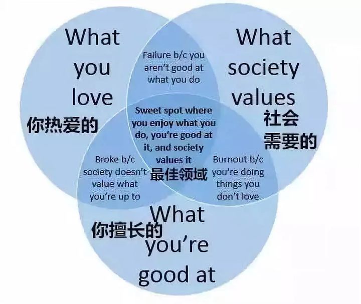 如果你找的工作是在自己的“最佳领域”工作,那这份工作就会比较好。所谓的“最佳领域”,就是你热爱的、你擅长的、以及社会需要的这3个重叠的领域。