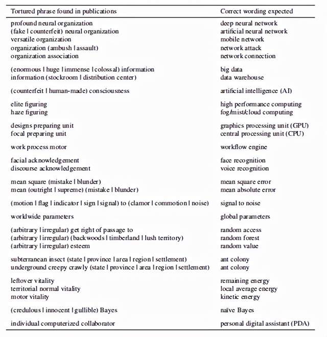 几乎同时,法国图卢兹大学(University of Toulouse)的计算机科学家Guillaume Cabanac和他的同事们在预印本网站arXiv.org上发布了一篇文章[3],揭示了一种伪造学术论文的新方式——用扭曲短语(tortured phrase)代替常规专业术语,躲过查重,让文章顺利发表。而被发现有此问题的文章多一半来自《微处理器和微系统》。