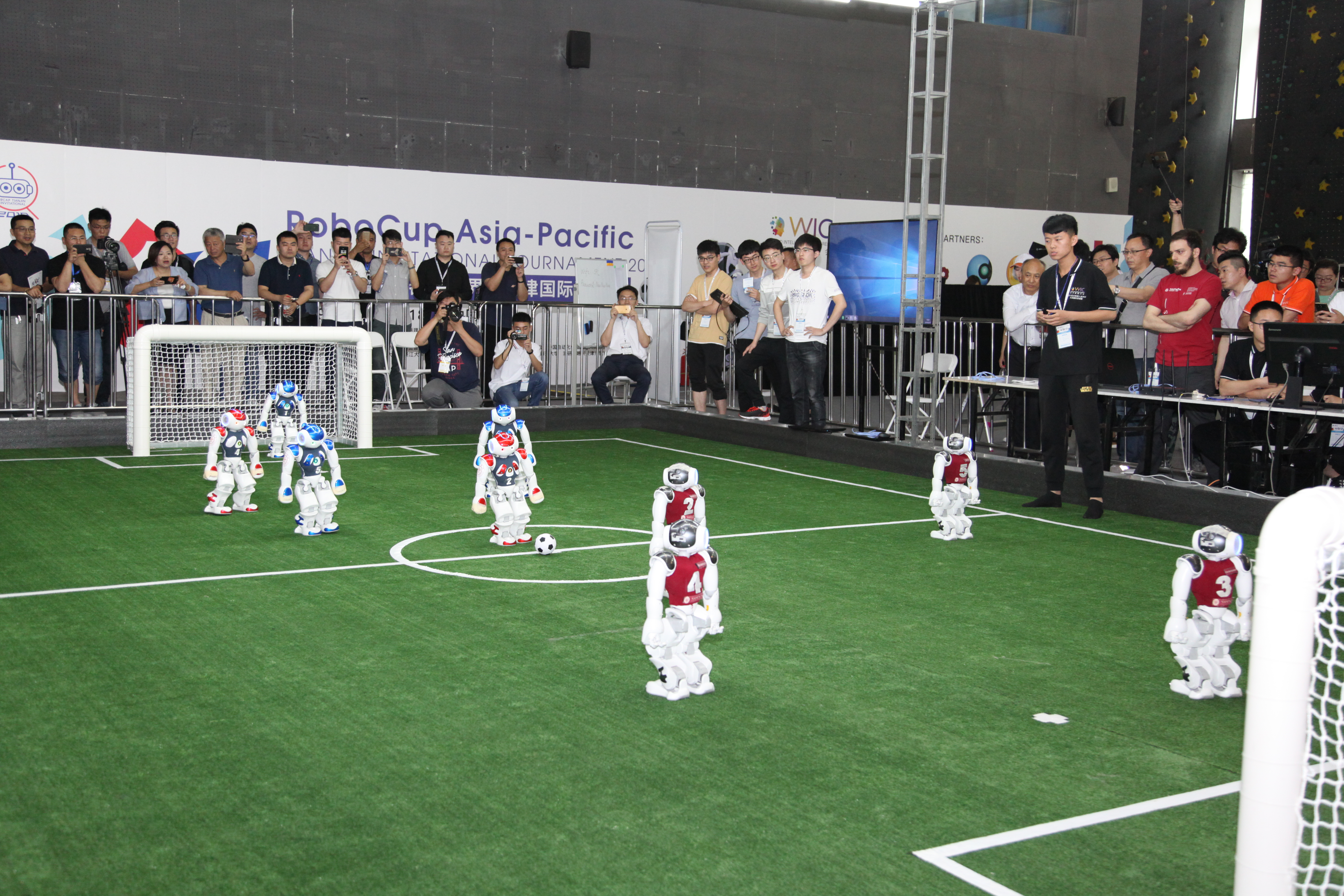 目前该项比赛双方各采用不超过5 台Nao双足机器人作为比赛队员、1台Nao 双足机器人作为教练,比赛用球为黑白色足球。比赛上下半场各10分钟,中场休息10分钟。在比赛过程中,机器人自主决策、自主运动,是RoboCup各项赛事中技术含量最高、观赏度最强的比赛之一。
