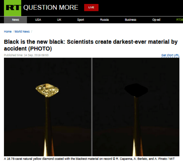 这种最黑材料,是由镶嵌在仅1cm左右厚度的氧化铝方块中的碳纳米管制成。材料内部结构能够吸收一定范围内几乎所有的电磁辐射。这就意味着用它所制造出来的材料,有可能躲过雷达的探测。相比较而言,普通黑色材料或多或少都会有反射光线。