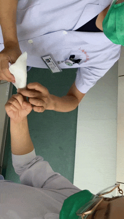 以常见的手外伤为例,如果伤口位于手掌或者手指的中节或者近节,在纱布包扎的时候,一定把手指的末节暴露,以便观察末梢的血供、感觉变化。