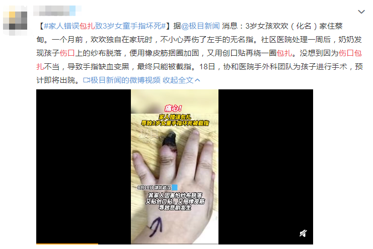 一名3岁女童手指受伤,但因为伤口包扎不当,后来导致手指缺血变黑,最终竟然只能被截指。