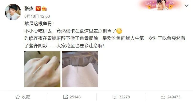 近日,知名歌手张杰在社交平台提到自己吃鱼时不慎将鱼刺卡在食道,连夜去医院,在胃镜麻醉下做了鱼骨摘除,还提醒大家吃鱼一定要注意。