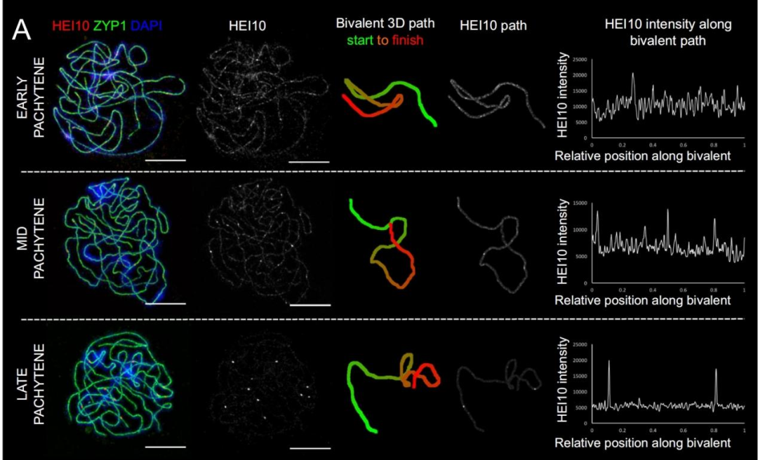2012年,法国让-皮埃尔·布尔然(Jean-Pierre Bourgin)研究所的科学家在此前研究的基础上,发现了一种新的蛋白HEI10(一种泛素连接酶),它属于一类被称为ZMM的蛋白。后者在减数分裂中主要负责调控同源染色体上的基因片段交换。此前的研究已经发现这类蛋白中的多种蛋白各有分工:一些蛋白负责将两条染色体拉近,维持稳定的结构,另一些促进DNA的重组。