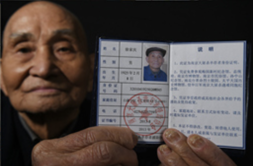 徐家庆在展示自己的南京大屠杀幸存者证(图自新华网,2019年11月26日摄 )。