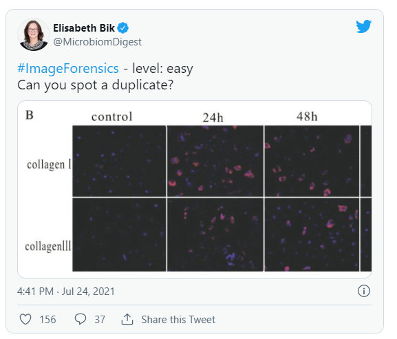 2021年7月24日,Bik曾在个人推特上发过一条简单的“大家来找茬”挑战,你能不能找出几幅图片中的重复之处呢?|来源:Elisabeth Bik 推特