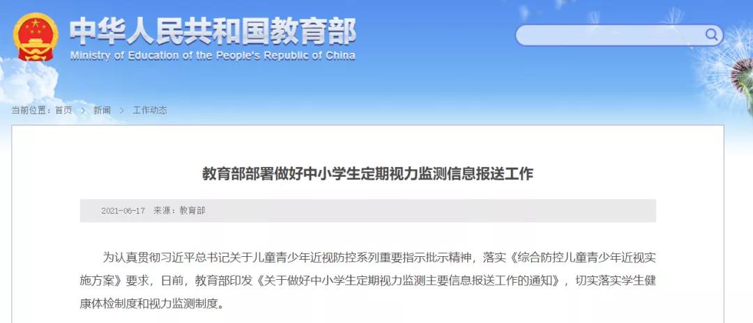 为认真贯彻习近平总书记关于儿童青少年近视防控系列重要指示批示精神,落实《综合防控儿童青少年近视实施方案》要求,教育部印发《关于做好中小学生定期视力监测主要信息报送工作的通知》,切实落实学生健康体检制度和视力监测制度。一起来看通知要点↓↓↓