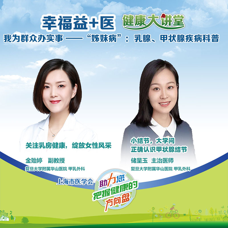 其实,甲状腺疾病和乳腺疾病是一对多发“姊妹病”。 随着现代生活节奏的加快和各种电子设备的使用,工作环境中的辐射量也在增加,乳腺和甲状腺疾病在现代社会中已经逐渐成为高发疾病。 我为群众办实事, 解决您的烦心事。由上海市医学会(上海市健康科普文化基地)联合上海静安幸福益站志愿服务共同主办的“幸福益+医,健康大讲堂”活动持续进行中。 8月25日(周三)下午2点,我们将邀请到复旦大学附属华山医院甲乳外科金贻婷副教授、储呈玉主治医生,共同带来《我为群众办实事——“姊妹病”:乳腺、甲状腺疾病科普》视频直播,和大家一起关注乳房健康,正确认识甲状腺结节,了解小结节的大学问。