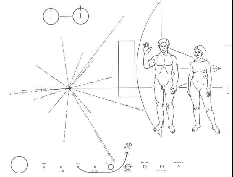 先驱者金属板上面有氢原子、太阳系、太阳的位置、裸体人类的形象(这个图像招致了外界的批评)等图案 | Wikipedia