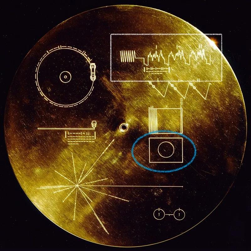 白方块里的声波图案,经过解码之后会呈现出蓝圆圈里的圆形 | NASA / Wikipedia